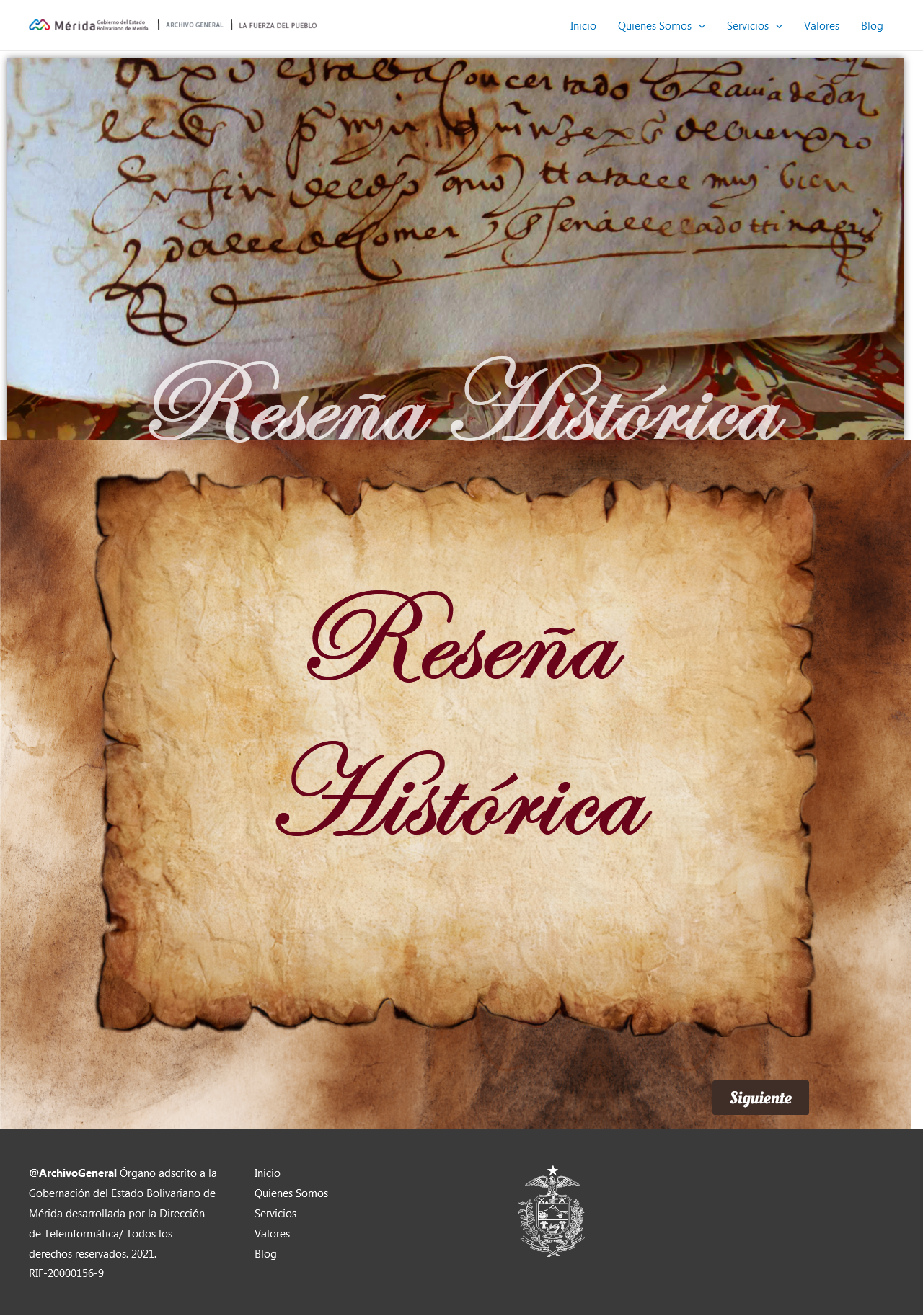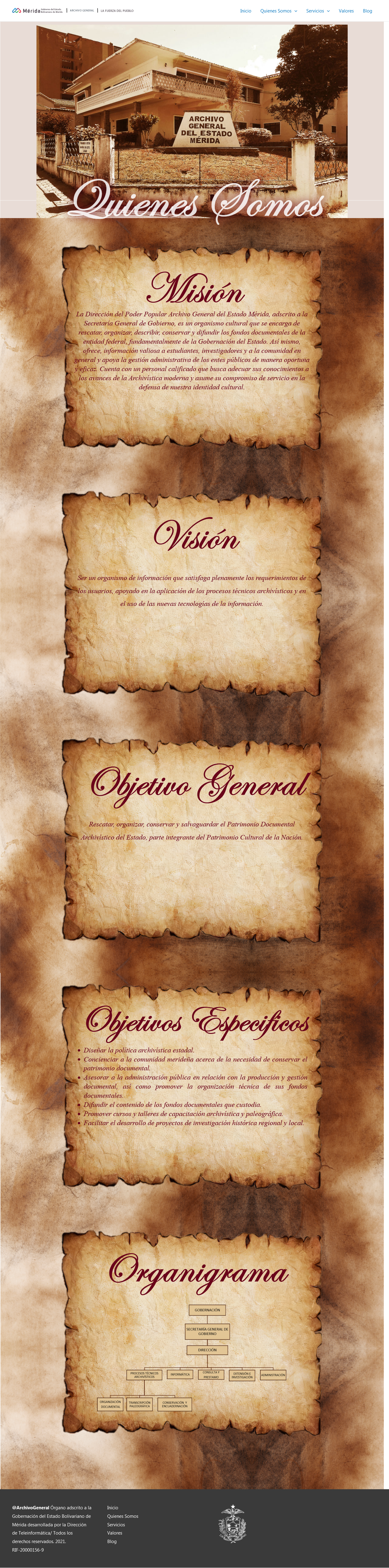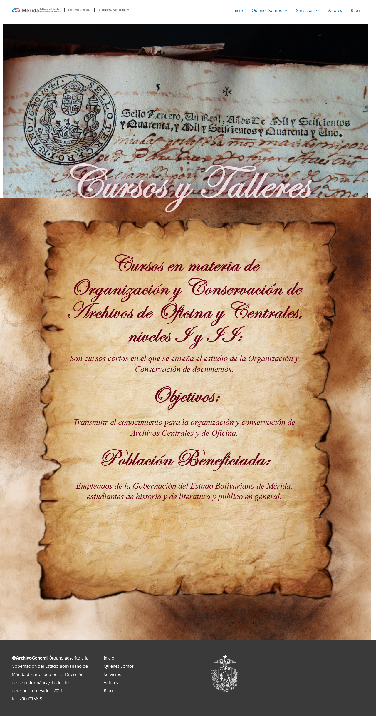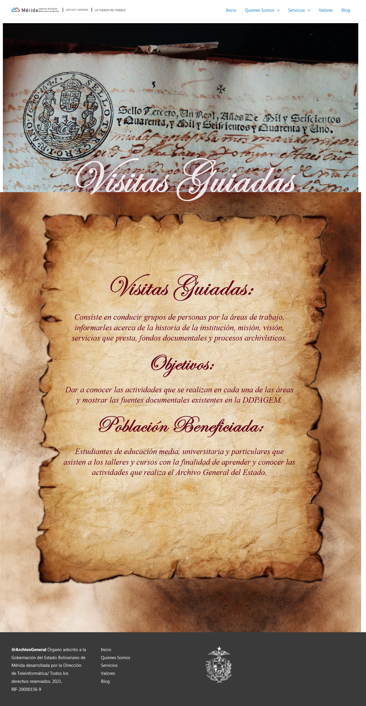 Sitio web diseñado y desarrollado en wordpress, con herramientas de facil maquetación. esta página interactiva contiene una página principal con 5 secciones, encabezado, descripción, servicios, noticias, contacto. luego en el menú que se logra encontrar en la parte superior e inferior del sitio web, se puede ubicar las otras paginas para su facil navegación, quienes somos, reseña histórica, directorio, servicios, valores, blog. Éste sitio web a sido desarrollado para el Archivo General del Estado Mérida, ente adscrito a la Gobernación del Estado Bolivariano de Mérida.