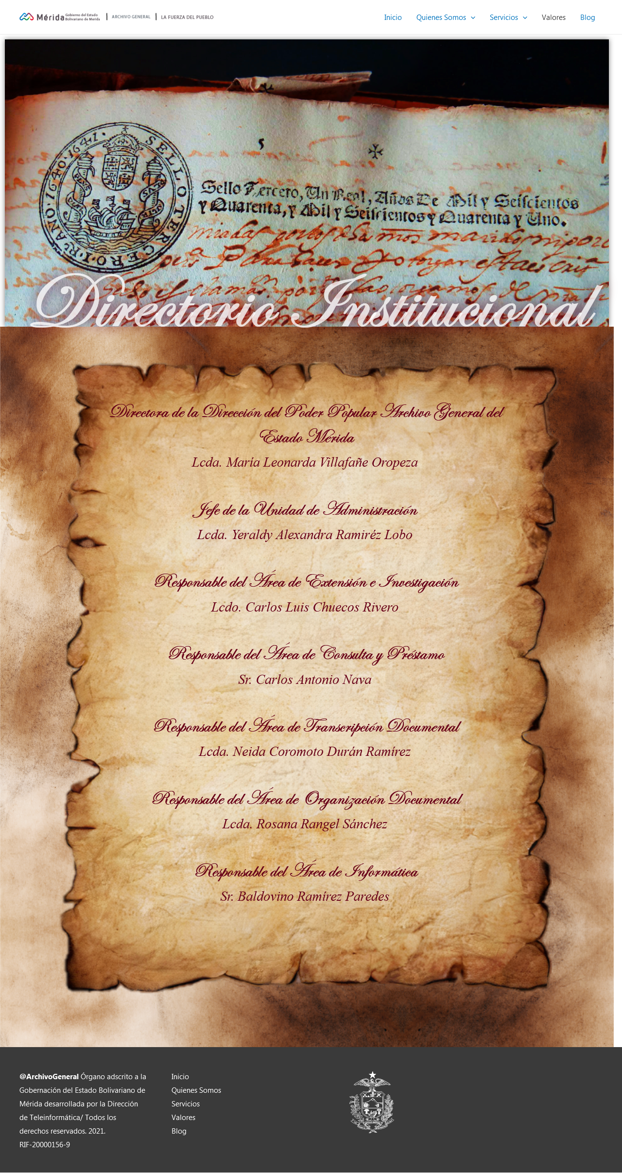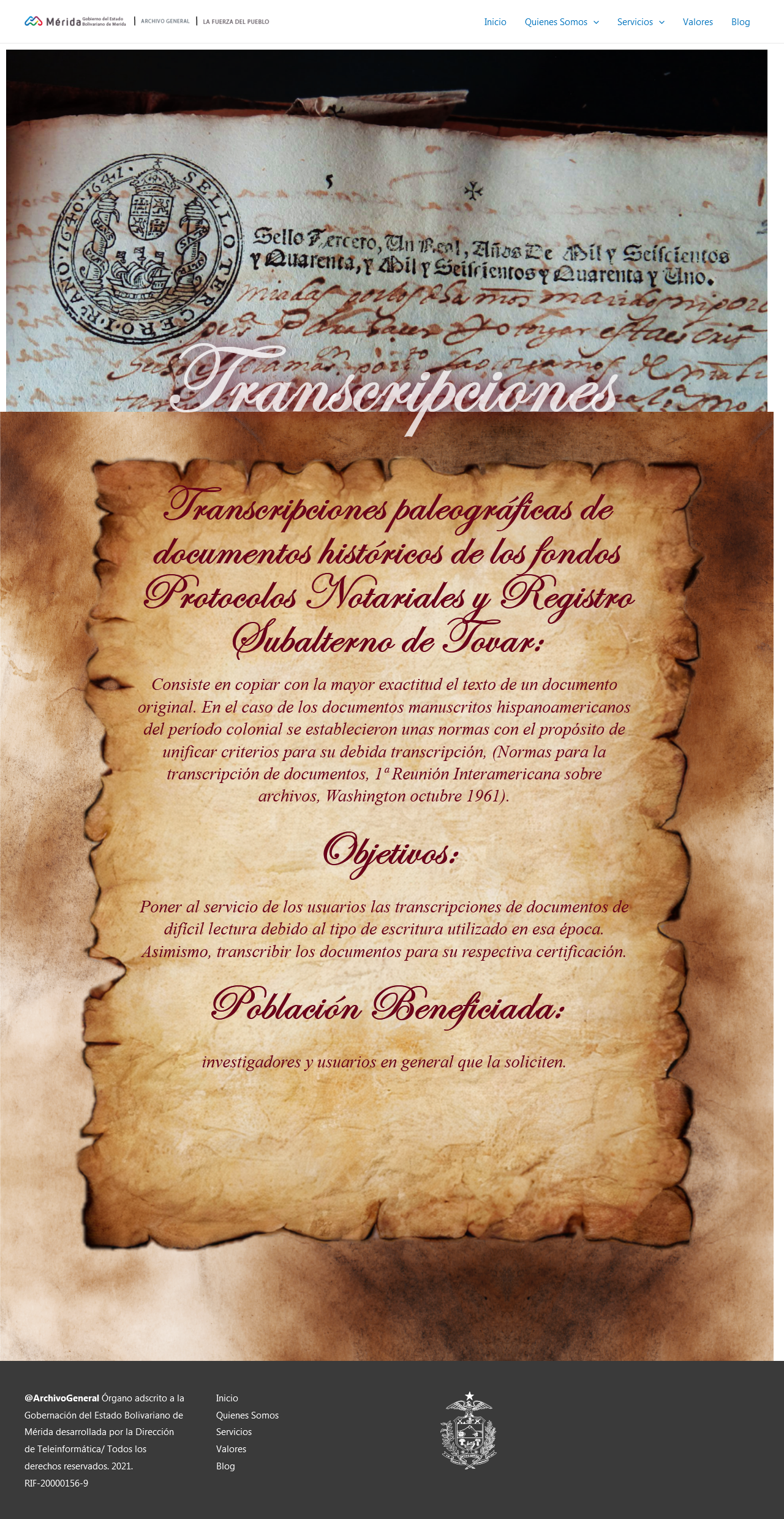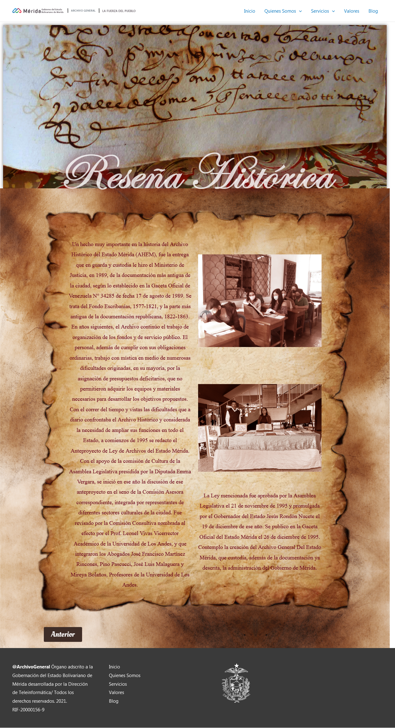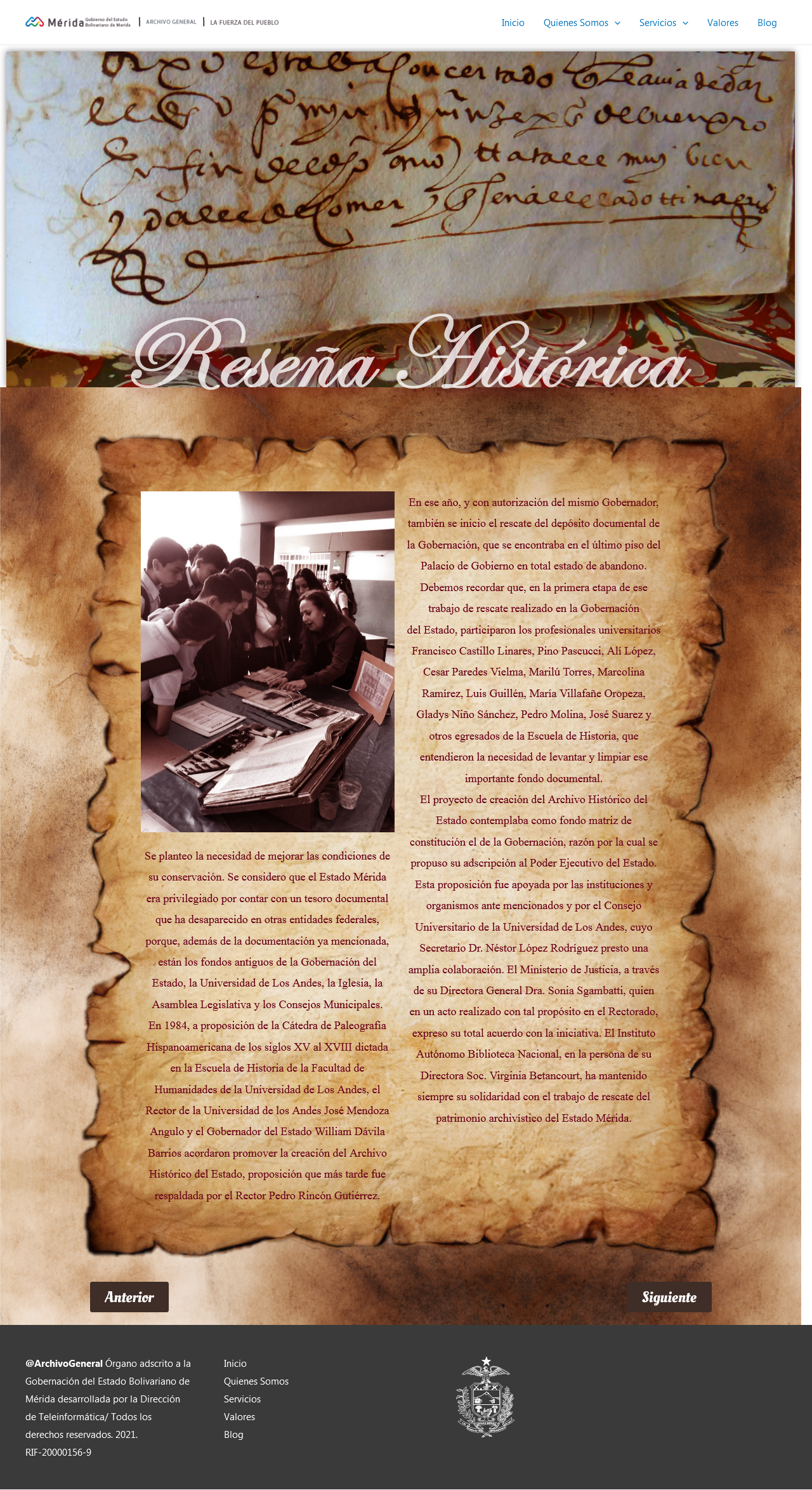 Sitio web diseñado y desarrollado en wordpress, con herramientas de facil maquetación. esta página interactiva contiene una página principal con 5 secciones, encabezado, descripción, servicios, noticias, contacto. luego en el menú que se logra encontrar en la parte superior e inferior del sitio web, se puede ubicar las otras paginas para su facil navegación, quienes somos, reseña histórica, directorio, servicios, valores, blog. Éste sitio web a sido desarrollado para el Archivo General del Estado Mérida, ente adscrito a la Gobernación del Estado Bolivariano de Mérida.