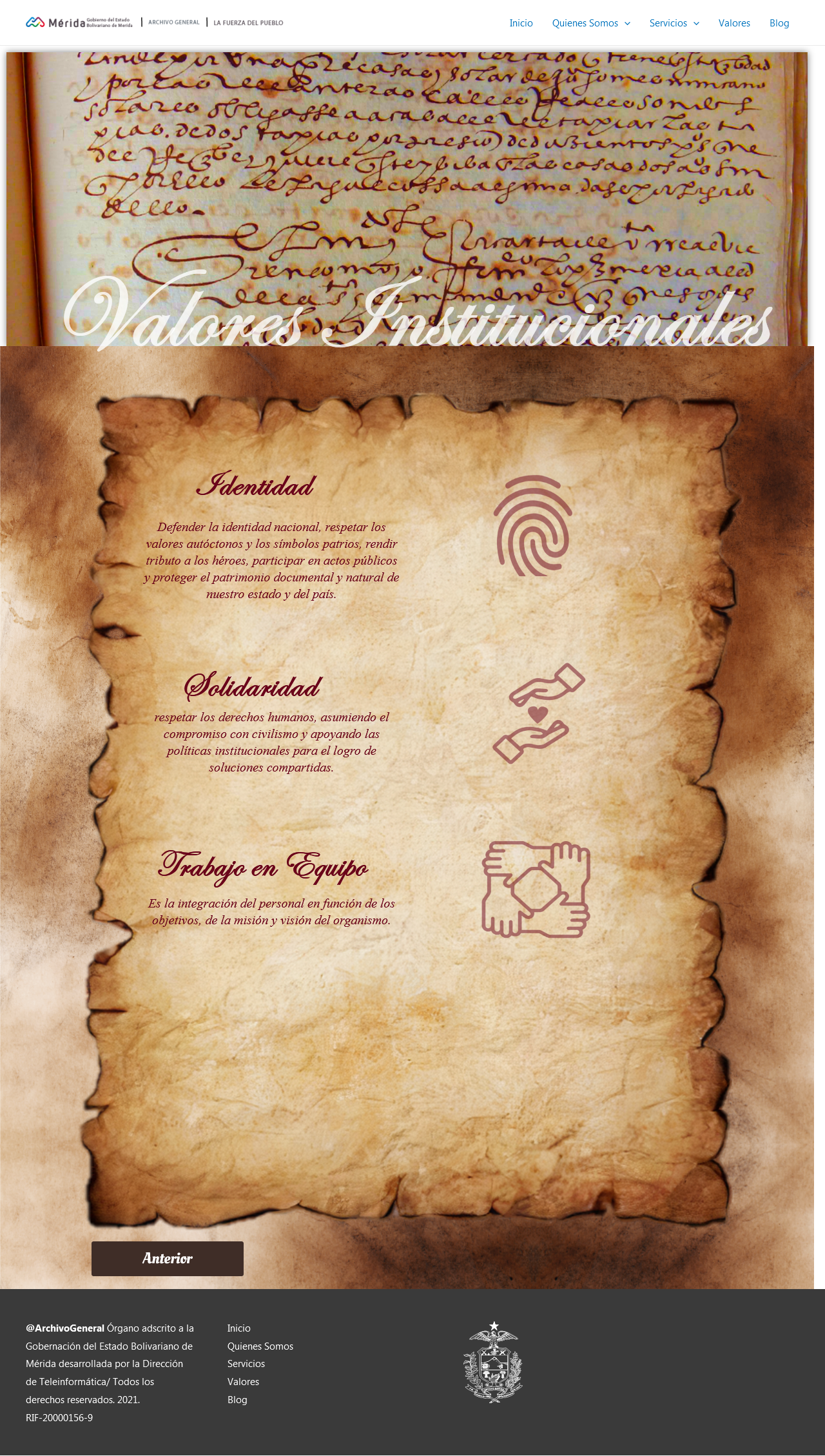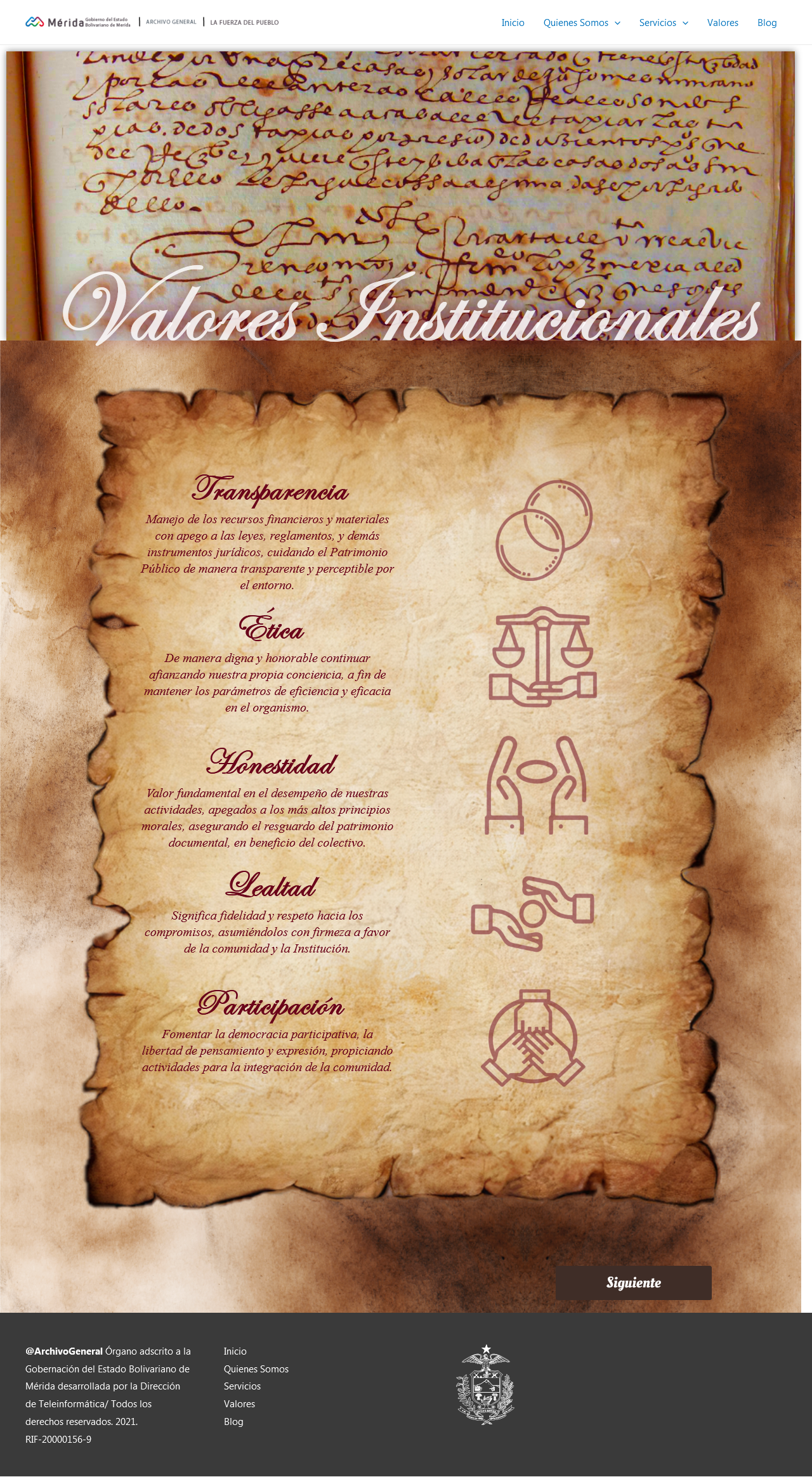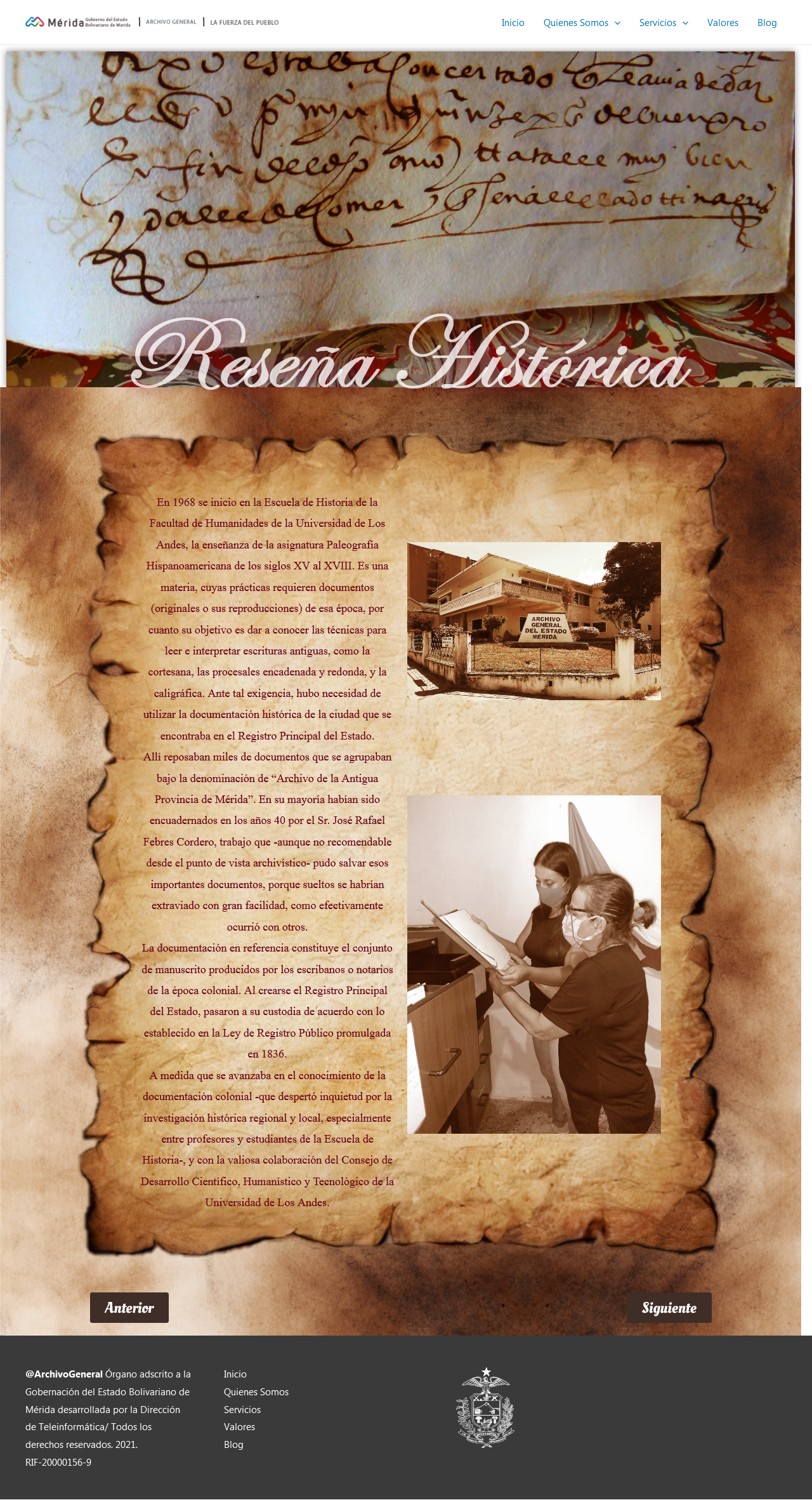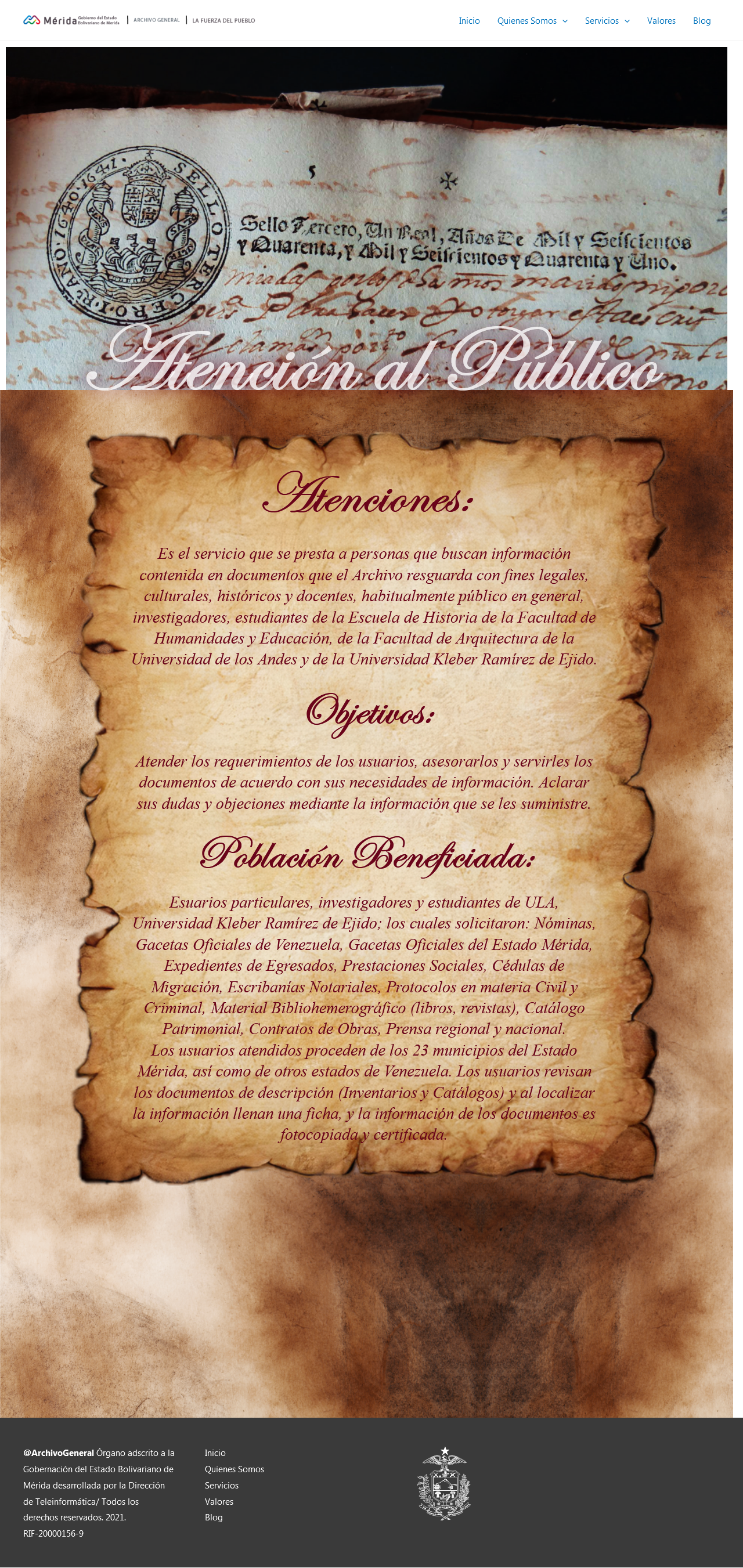 Sitio web diseñado y desarrollado en wordpress, con herramientas de facil maquetación. esta página interactiva contiene una página principal con 5 secciones, encabezado, descripción, servicios, noticias, contacto. luego en el menú que se logra encontrar en la parte superior e inferior del sitio web, se puede ubicar las otras paginas para su facil navegación, quienes somos, reseña histórica, directorio, servicios, valores, blog. Éste sitio web a sido desarrollado para el Archivo General del Estado Mérida, ente adscrito a la Gobernación del Estado Bolivariano de Mérida.