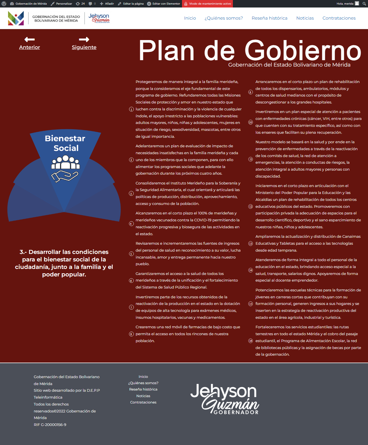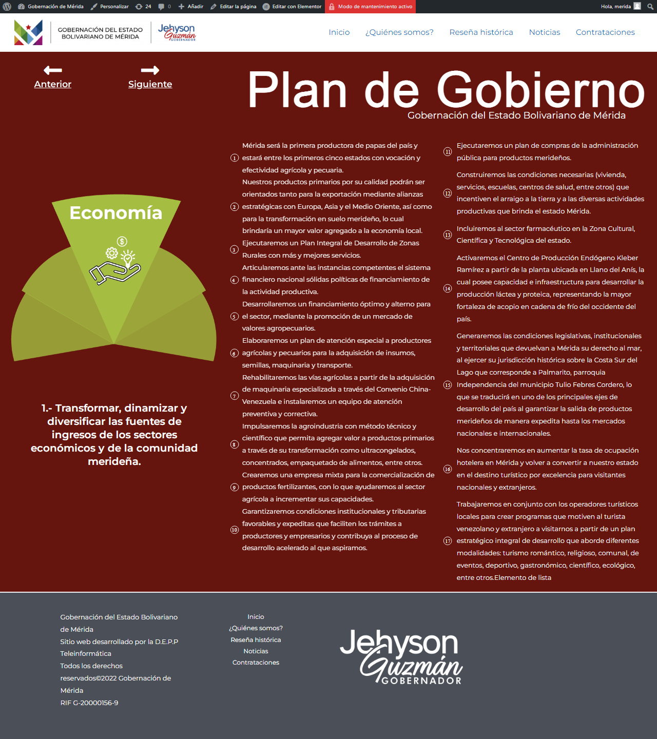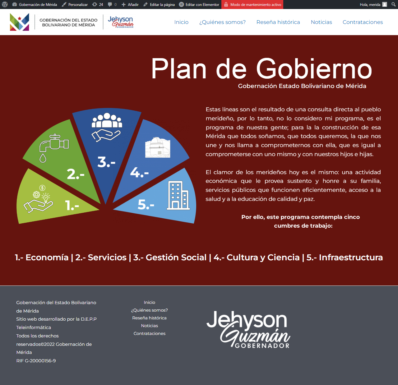 Sitio web diseñado y desarrollado en wordpress, con herramientas de facil maquetación. esta página interactiva contiene una página principal con 5 secciones, encabezado, descripción, servicios, noticias, contacto. luego en el menú que se logra encontrar en la parte superior e inferior del sitio web, se puede ubicar las otras paginas para su facil navegación, ¿quienes somos?, reseña histórica, noticias, contrataciones. Éste sitio web es el principal para la Gobernación del Estado Bolivariano de Mérida.