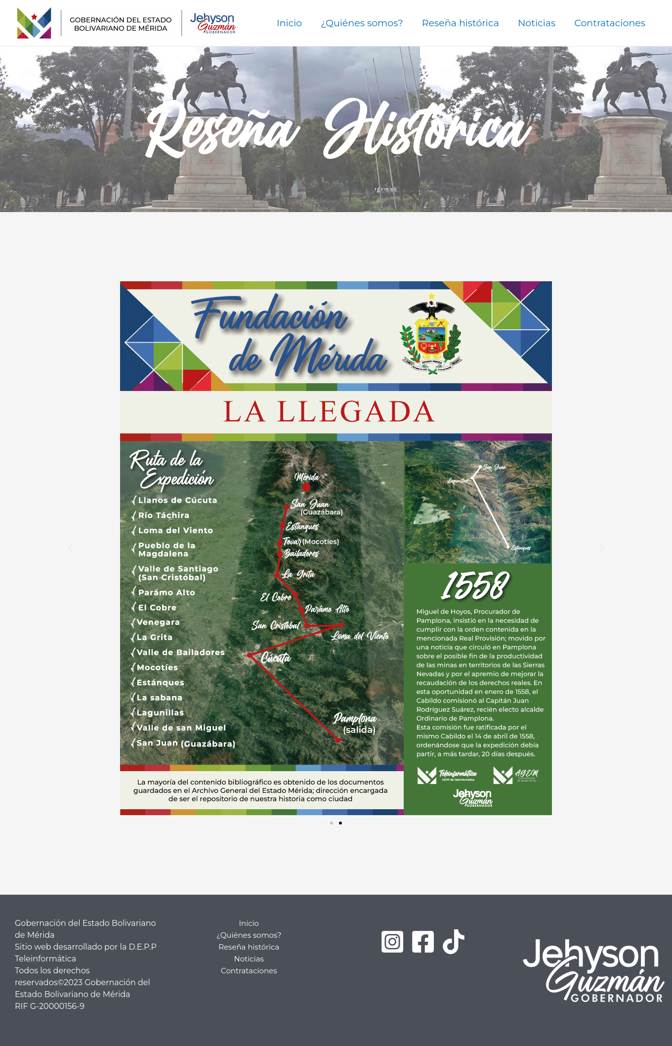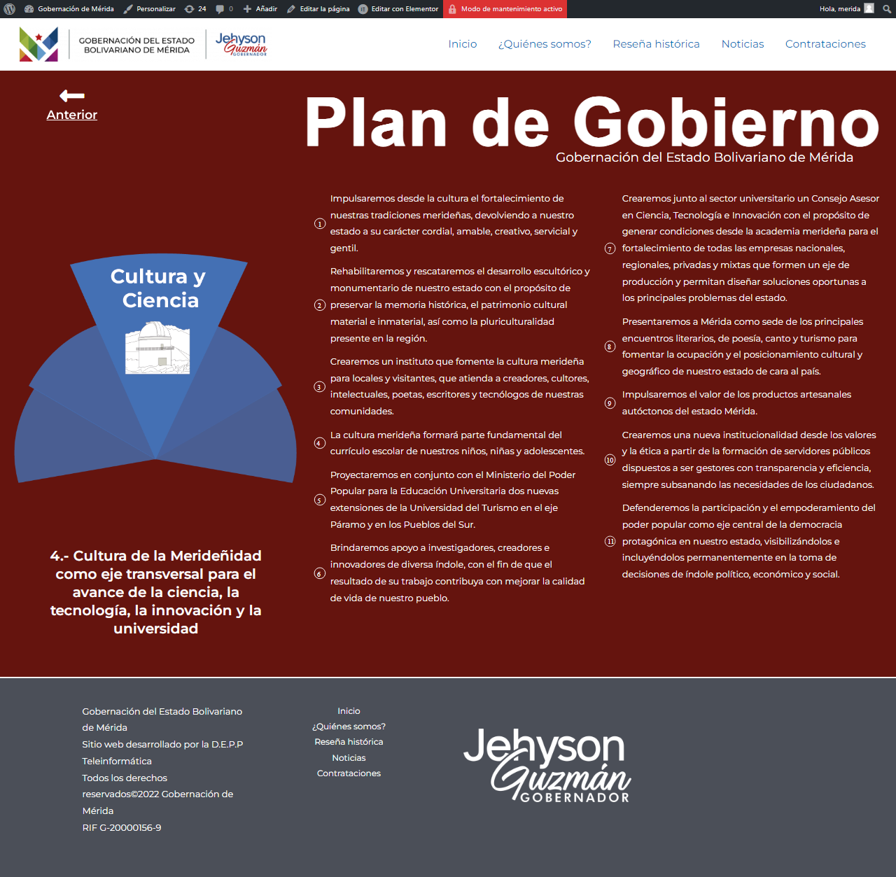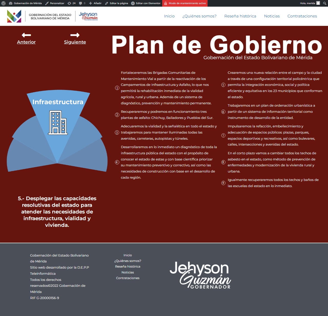 Sitio web diseñado y desarrollado en wordpress, con herramientas de facil maquetación. esta página interactiva contiene una página principal con 5 secciones, encabezado, descripción, servicios, noticias, contacto. luego en el menú que se logra encontrar en la parte superior e inferior del sitio web, se puede ubicar las otras paginas para su facil navegación, ¿quienes somos?, reseña histórica, noticias, contrataciones. Éste sitio web es el principal para la Gobernación del Estado Bolivariano de Mérida.